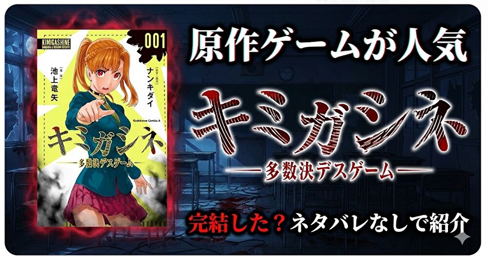 『キミガシネ -多数決デスゲーム-』は、2017年にRPGアツマールで公開され爆発的な人気を博した同名のフリーゲームを原作とする漫画作品です。原作ゲームの制作者であるナンキダイ自身が「原作・構成」を務め、作画を池上竜矢が担当しています。KADOKAWAの『月刊少年エース』にて2019年5月号から2023年10月号まで連載され、単行本は全5巻で完結しました。突如として理不尽な死のゲームに巻き込まれた11人の男女が、生存を懸けた心理戦と推理劇を繰り広げるサスペンス・ミステリーです。